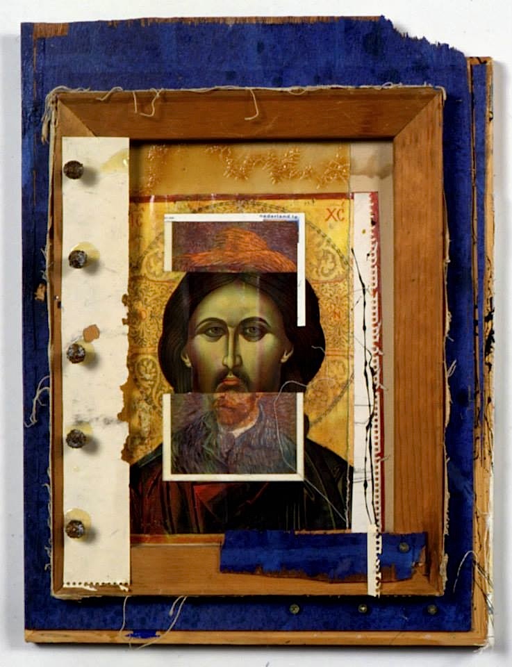 In 1999, after Mark’s death, his brother Rick was sorting through his belongings. He asked me if I knew anything about the photo. I claimed it. But I could no longer just hang it on the wall. It meant something new now. So I baptized it with paint, gesso, varnish and eucalyptus acorns.
