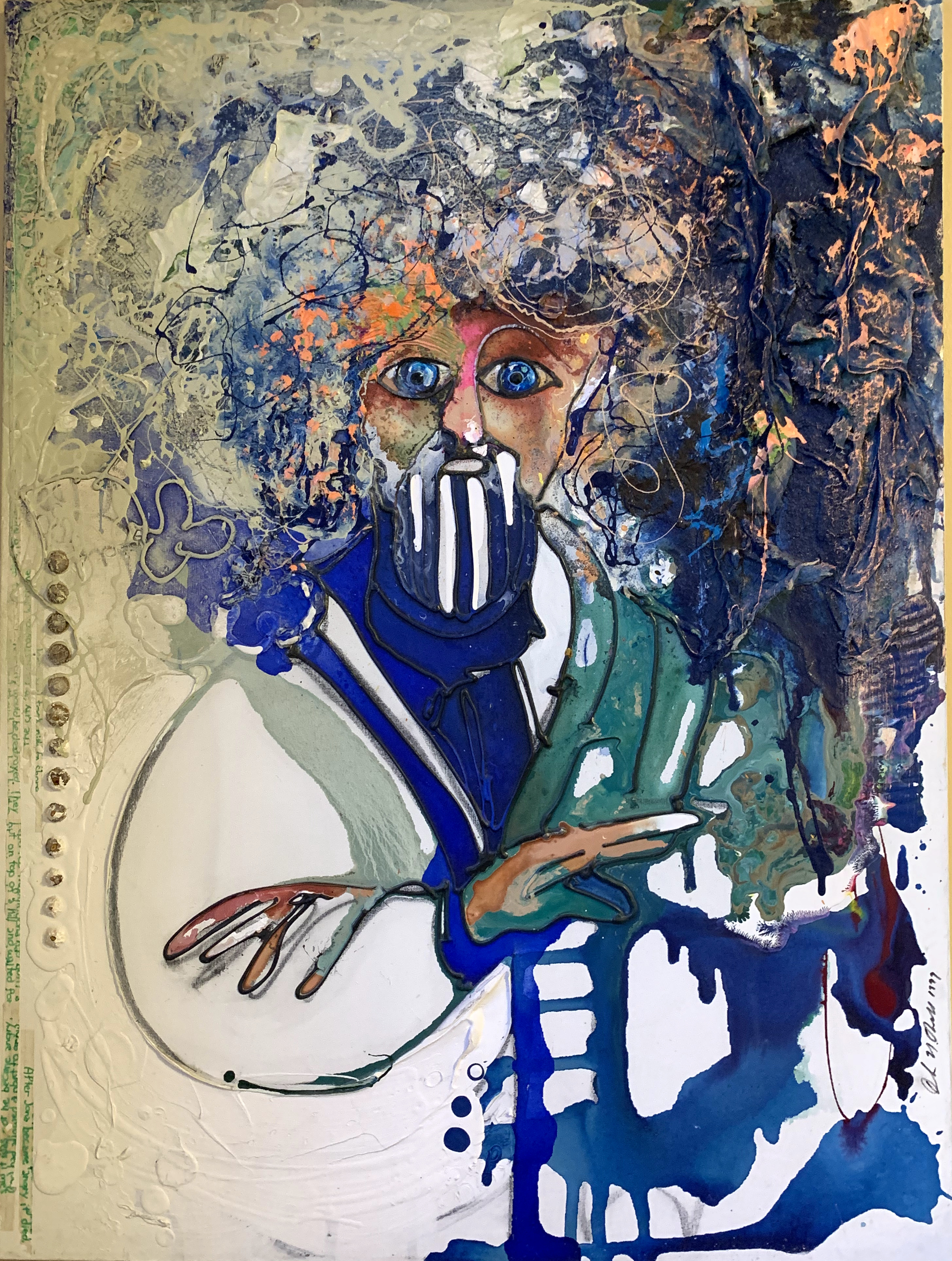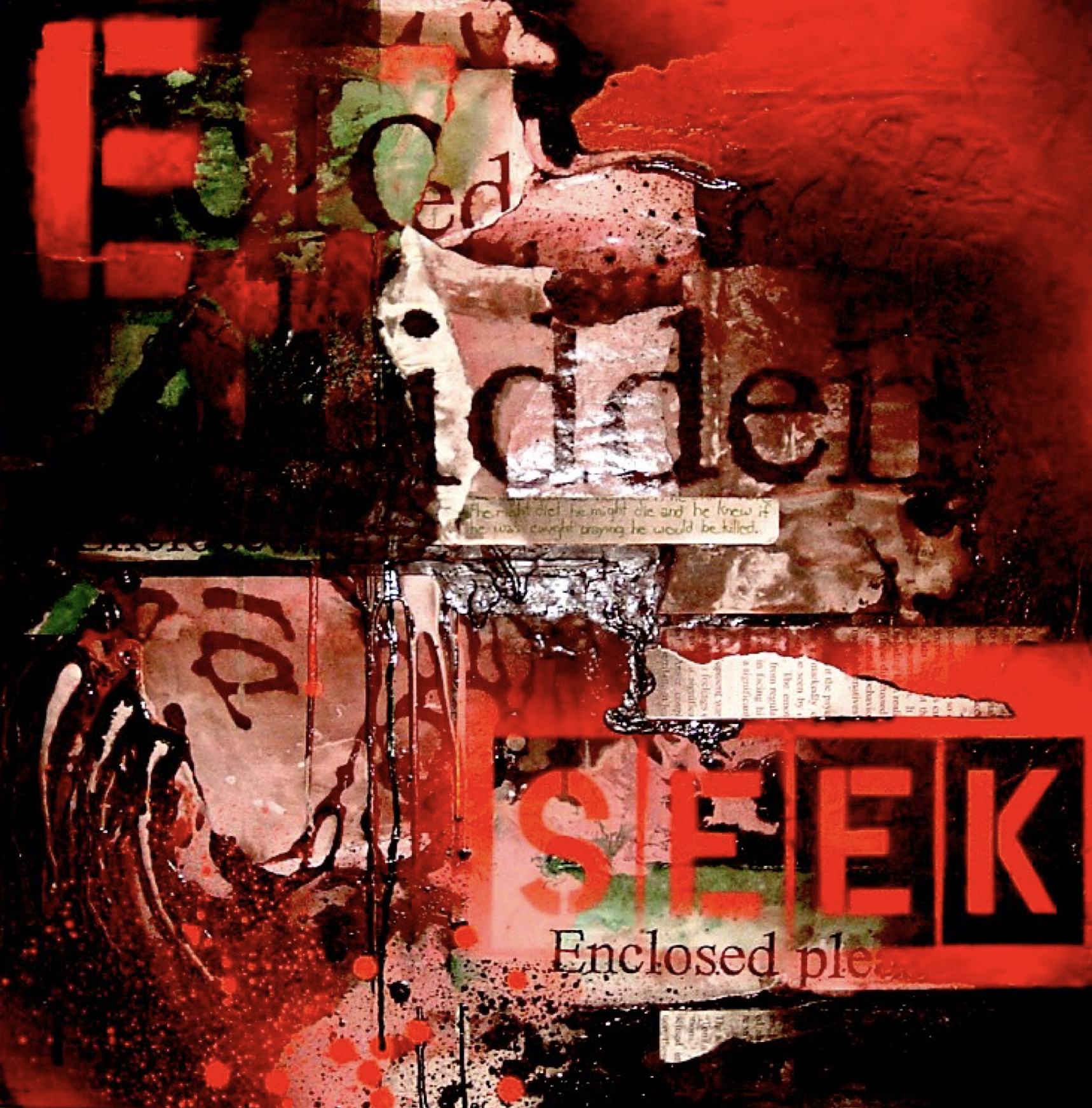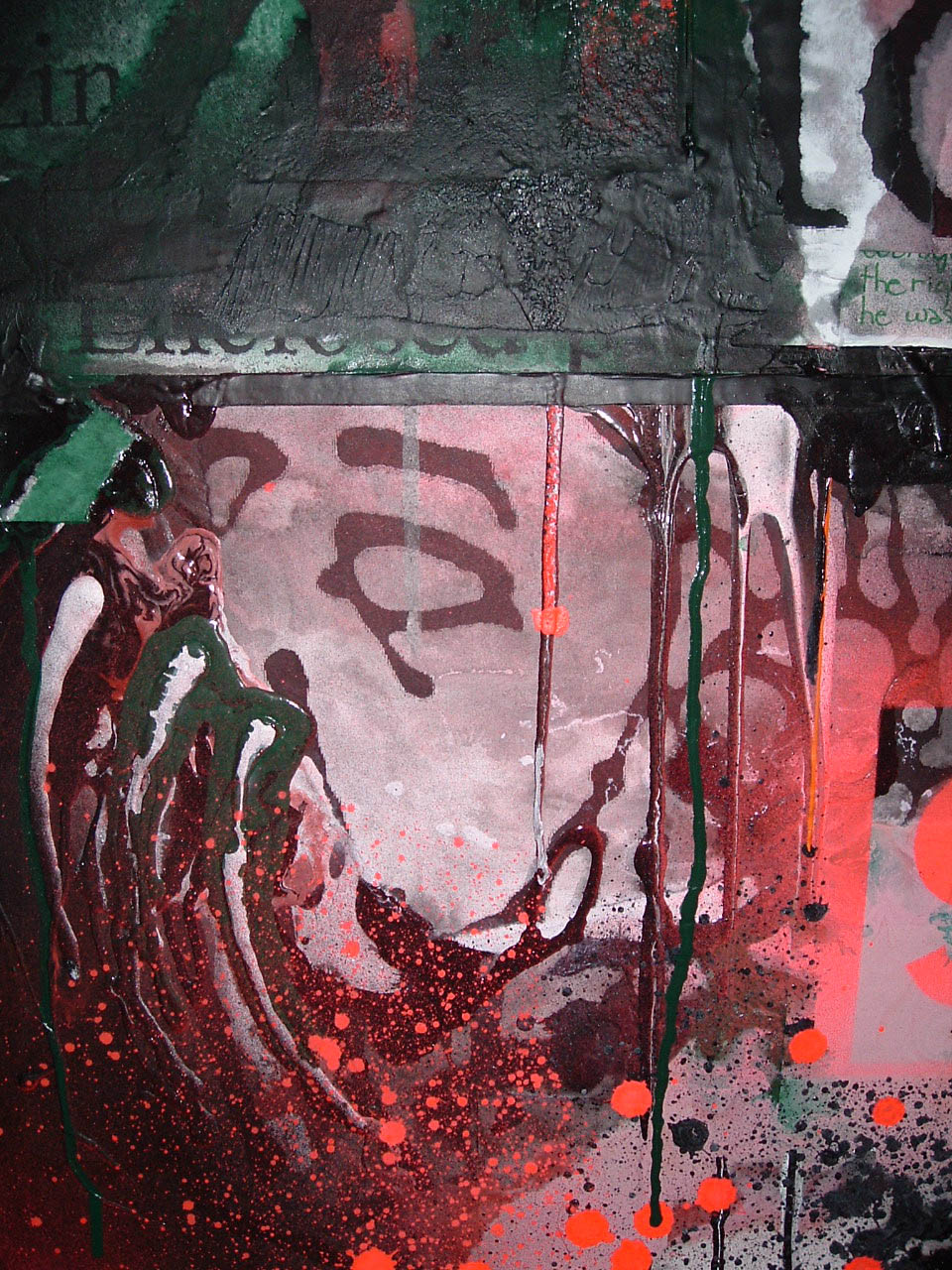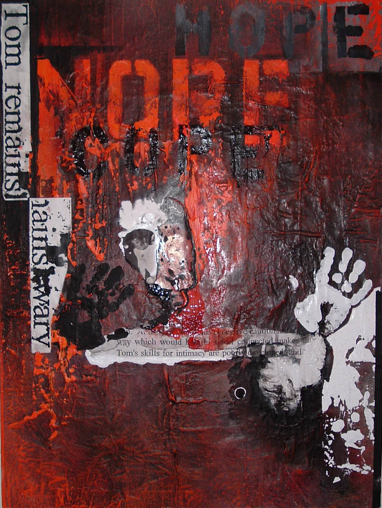 Here, I used the copied and enlarged text from the report, gesso, enamel and spray paint along with an enlarged image of a face copied from a medieval manuscript. The face is being “hushed” by a hand made up of gesso and enamel. In the center is a small piece torn from a 6th grade religion project. A tender Tommy, way back then, had been given an assignment to create a little booklet about the Prophets of the Old Testament. A fragment from that grammar school report, written in green marker on binder paper is placed at the very center of this painting. It reads, “…he knew if he were caught praying he would be killed.” Some forty years later that is exactly I how felt sitting in the waiting room in the treatment center before my first interview.