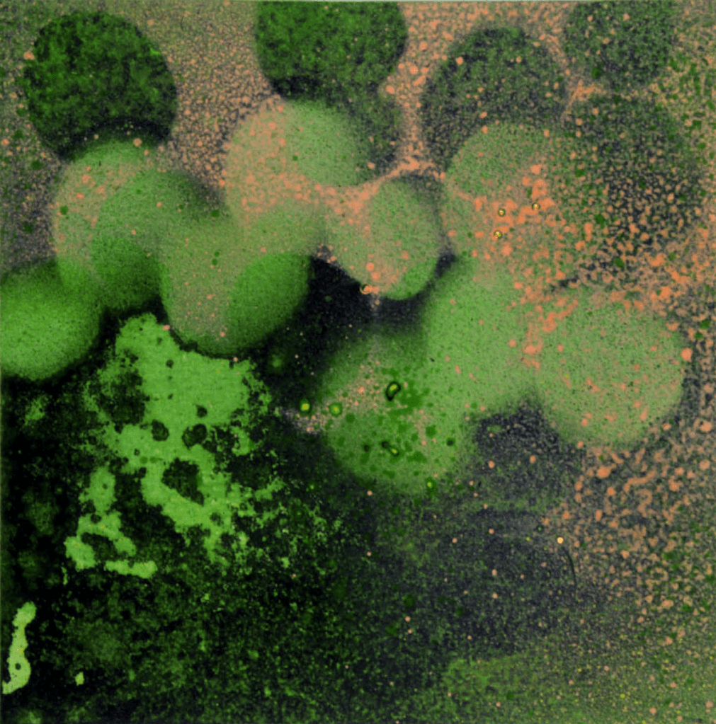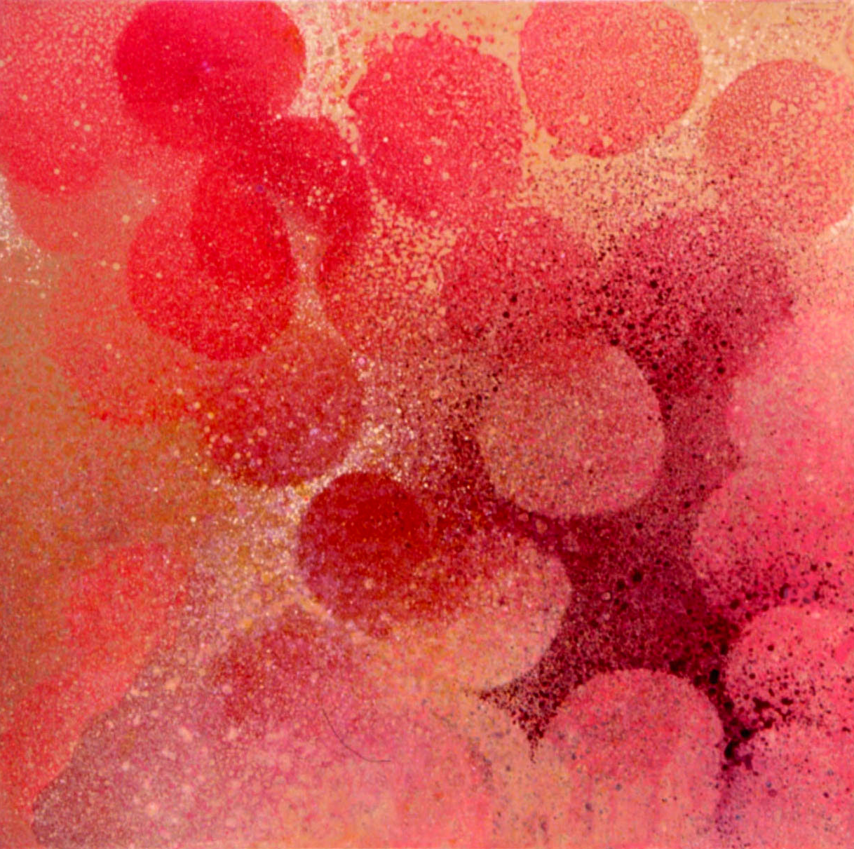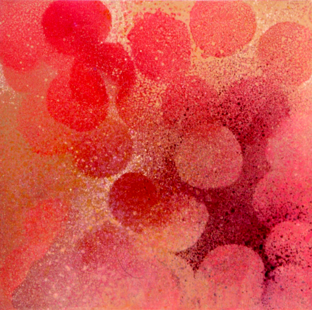 I began to use the pita bread as a stencil — placing them on the flat canvas and then splattering, spraying and pouring paint around them. I diluted the paint with water and medium and used a sprayer or, like our ancestors in their caves, blew the paint on the canvas from a straw.
