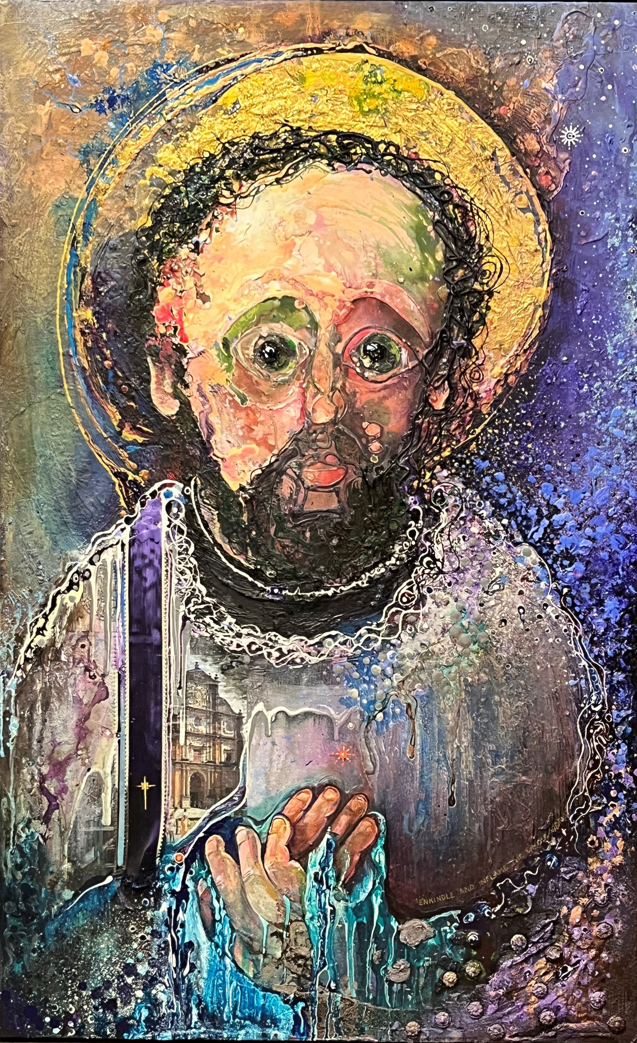 Finally, and this is from 1999. Someone in the L.M.U. Jesuit Community asked me do a painting of St. Francis Xavier. (Xavier was the name of the Jesuit residence at the time.) One of the Jesuits who lives there today was kind enough to send me a photograph of it. I remember not really liking it when I made it. I like it a little better now. I was beginning my love affair with drips, dribbles and splatters.