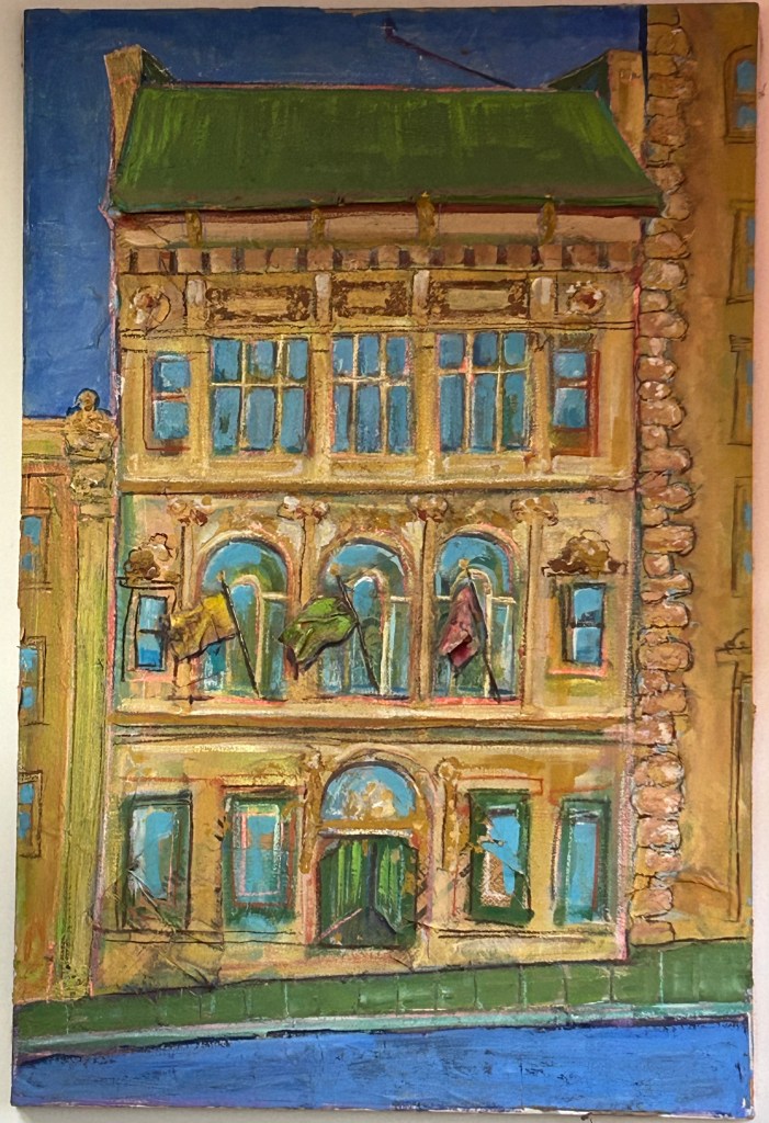 Again, from the 1980’s — a mixed-media work of “The Art Student’s League” in New York City. I took some painting classes there in the Spring of 1982. The whole place smelled of oil paint. Heaven. I think I made this painting when I was taking undergraduate art courses at L.M.U.