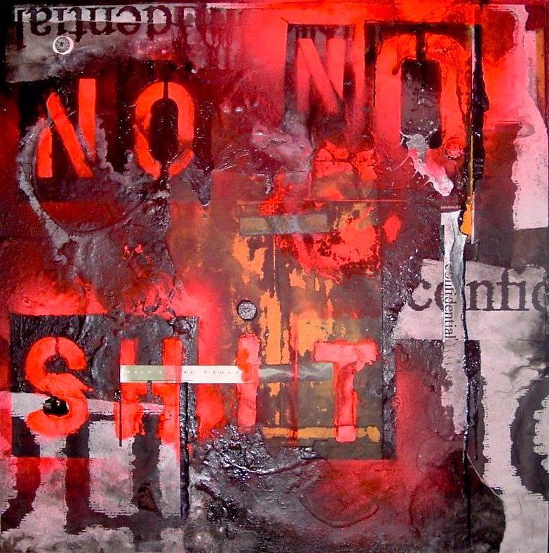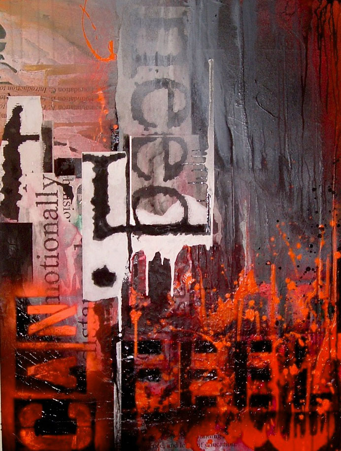 I never read it. When it appeared in my mailbox in a large manila envelope, I tore it apart — and with the help of a Xerox machine that enlarged the text — I began to collage fragments of the dissembled report into a series of very angry paintings. Using white gesso, black enamel and red, orange and pink fluorescent spray paint, I fashioned my own evaluation of the evaluation.