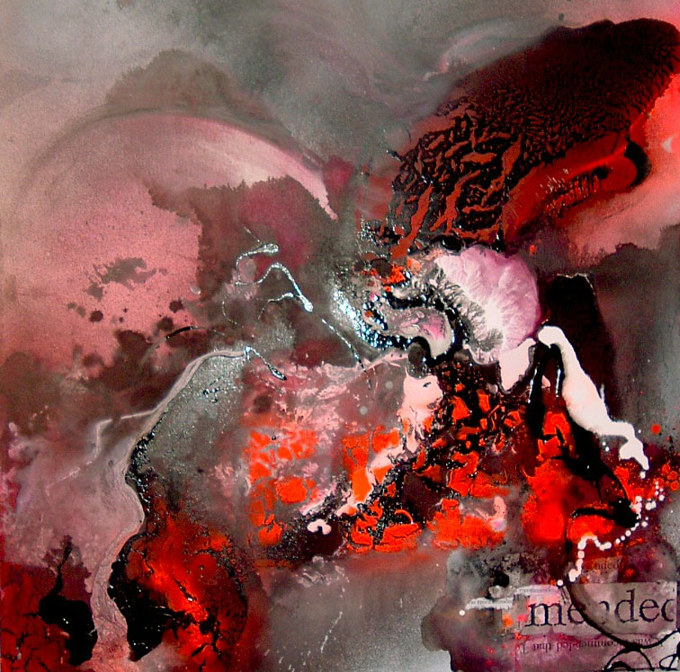 This was the first in the series. In the center of this large piece of watercolor paper is the manila envelope in which the report was sent. The word “Confidential” is stamped in red. Looking at it now, the white gesso and black enamel form a ghostly shape that is trying to claw back the report into my own possession. The splattered paint seems to have almost been spit upon the surface — and indication of my feelings about the whole experience. And if that wasn’t clear enough, the stenciled word, “MINE” not so subtly expressed my response to all of the questions and queries that had been made about my use and abuse of alcohol.